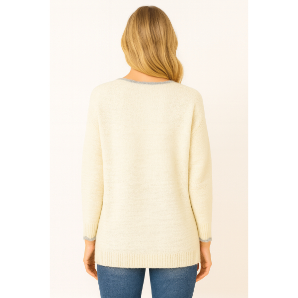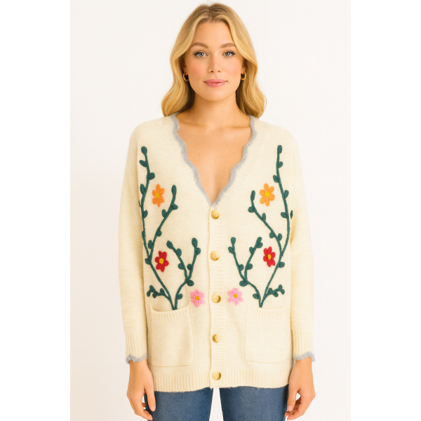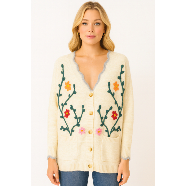 Ζακέτα πλεκτή μακρυμάνικη με διακοσμητικά λουλούδια. Κανονική εφαρμογή.