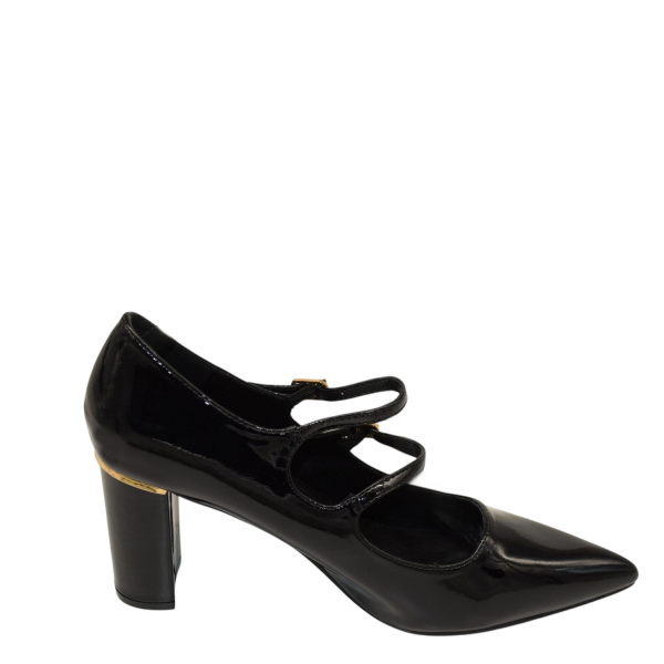 Γόβα με χοντρό τακούνι. Κλείνει με ρυθμιζόμενα λουράκι αστραγάλου.