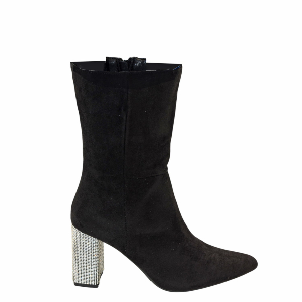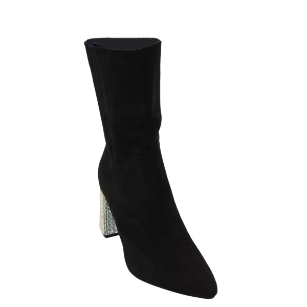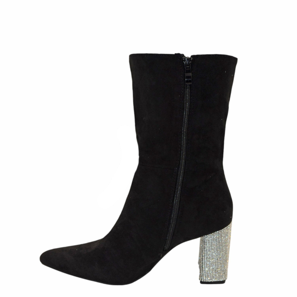 Μποτάκι σουέντ με strass στο τακούνι. Διαθέτει ψηλό τακούνι. Κλείνει με φερμουάρ.