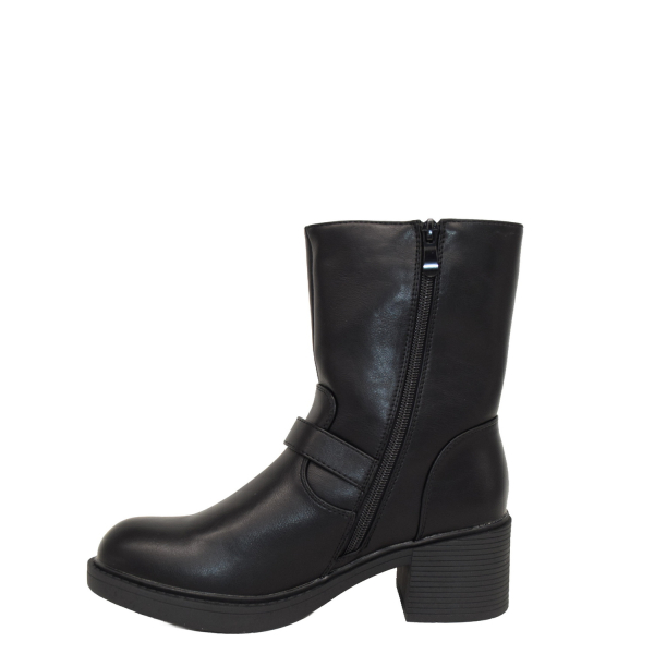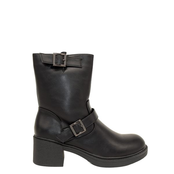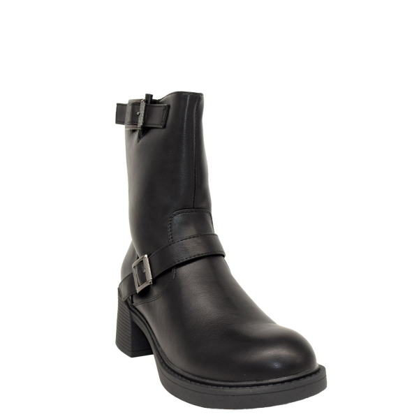 Μπoτάκι με χοντρό τακούνι και αγκράφες. Κλείνει με φερμουάρ.