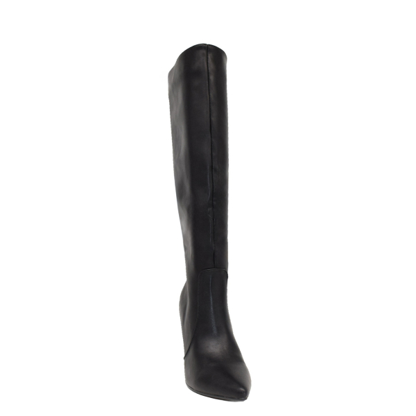 Μπότα μυτερή με ψηλό τακούνι. Κλείνει με φερμουάρ.