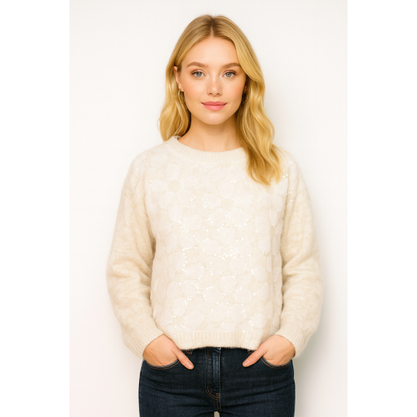 Long sleeve knit blouse with decorative flowers. Regular fit.