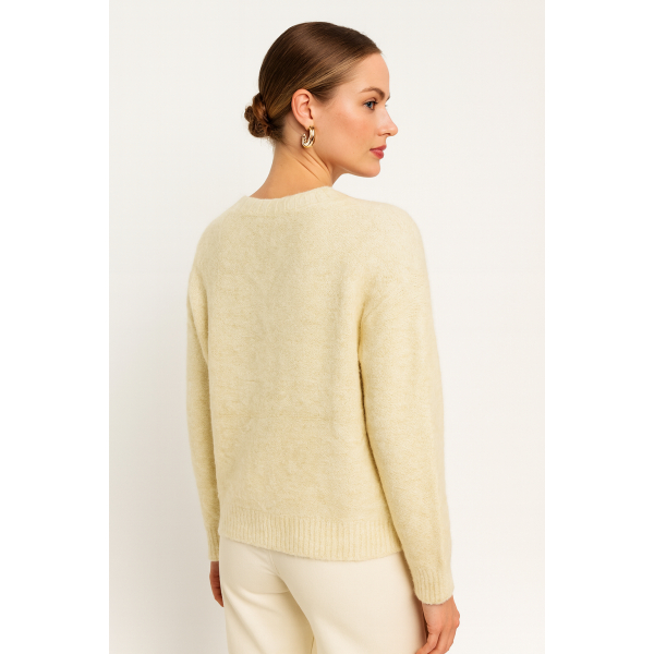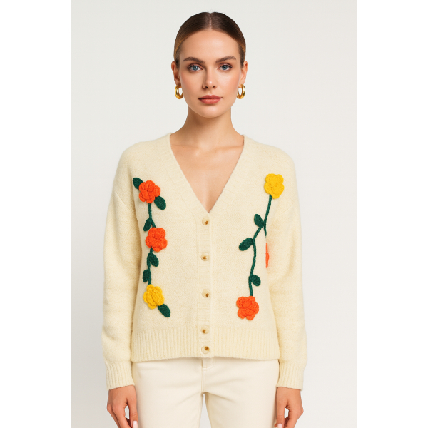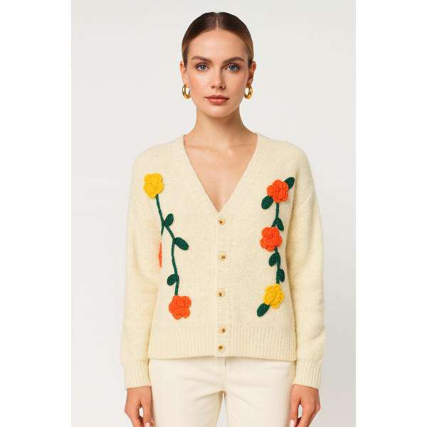 Long sleeve knit cardigan with decorative flowers . Regular fit.