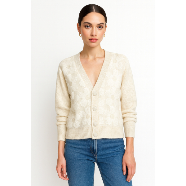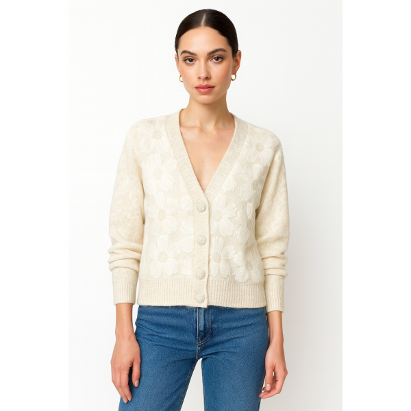 Long sleeve knit cardigan with decorative flowers . Regular fit.