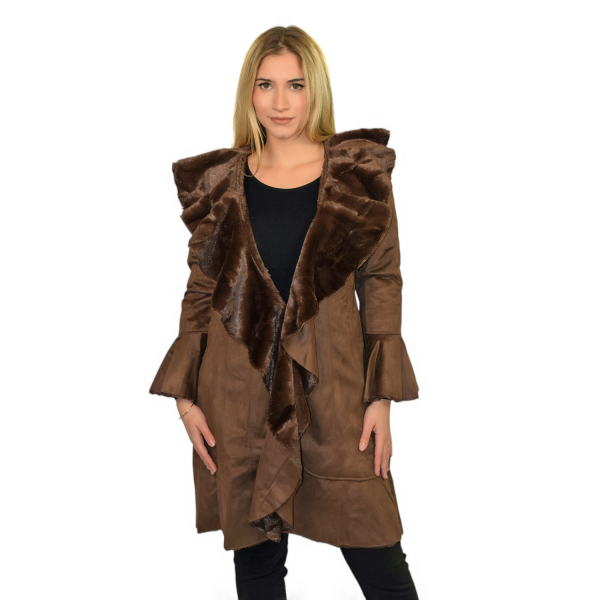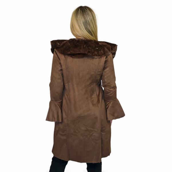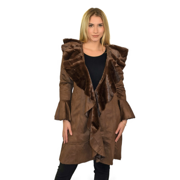 Suede coat with fur lining inside. It closes with hidden clasp. Normal fit .
