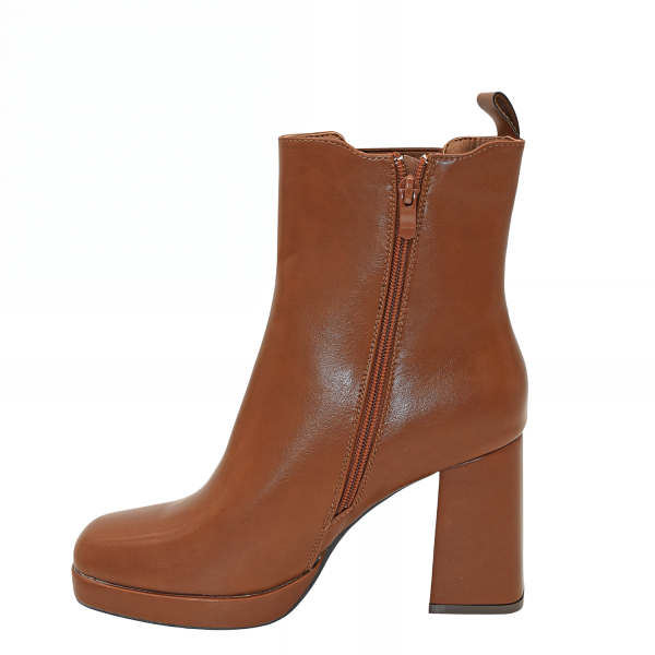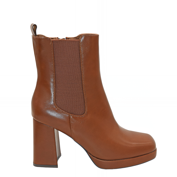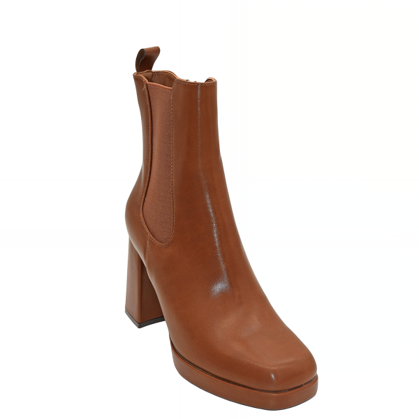 Bootie with elasticated sides. Features high heel. Fastens with zipper.