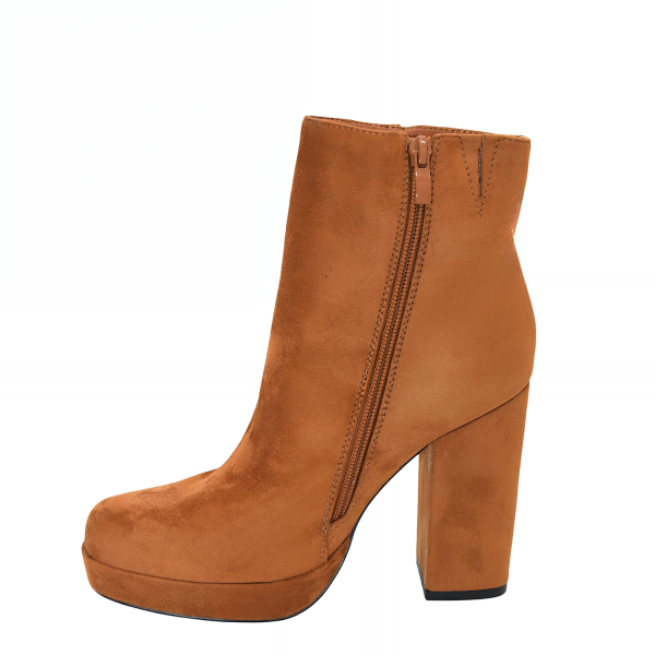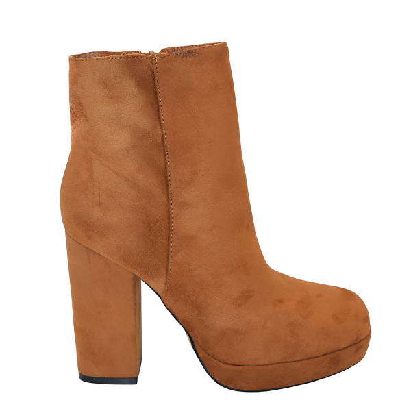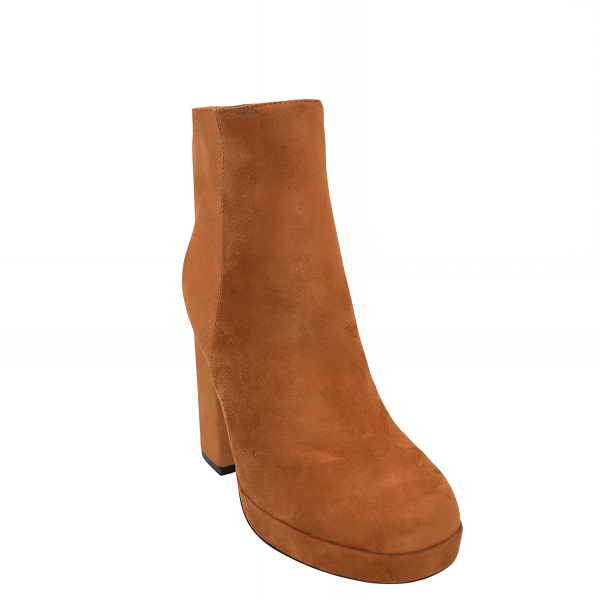 Suede Bootie.  Features high block heel. Fastens with zipper.