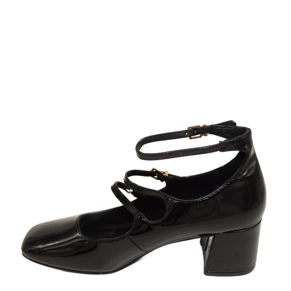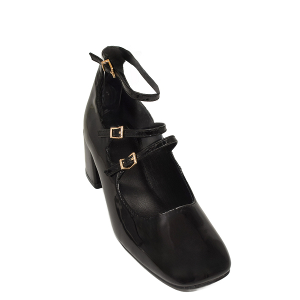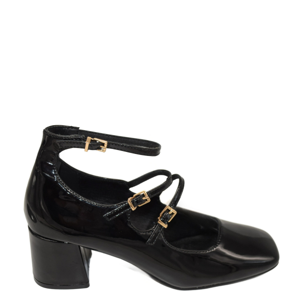 Pump with block heel. Features with adjustable ankle strap.
