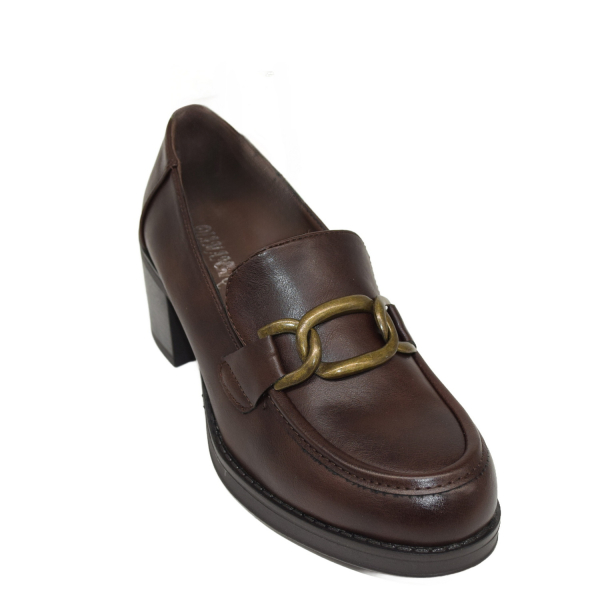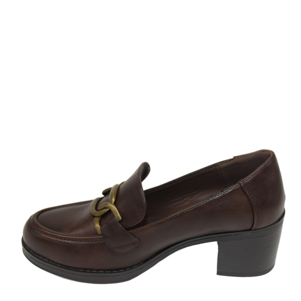 Pump with block heel and decorative buckle.