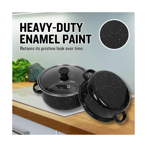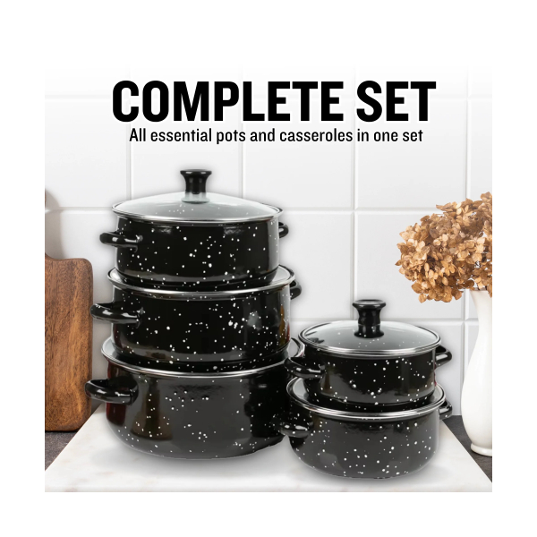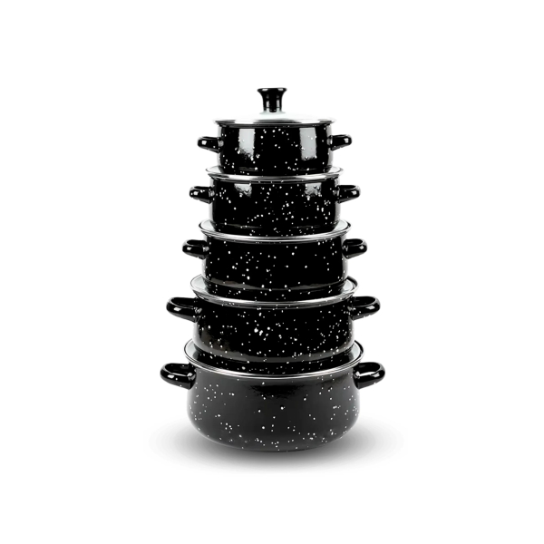 Set of non-stick cookware made of stainless steel with enamel coating.